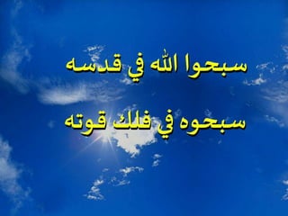 النص يتضمن تكرار عبارة 'هللويا' مع إشارات لتسبيح الله وقواته وأعماله العظيمة. كما يشير إلى ضرورة تسبيح كل نفس للرب. يشمل أيضًا الإشارة إلى أدوات موسيقية مثل الدف والمزمار في سياق العبادة.