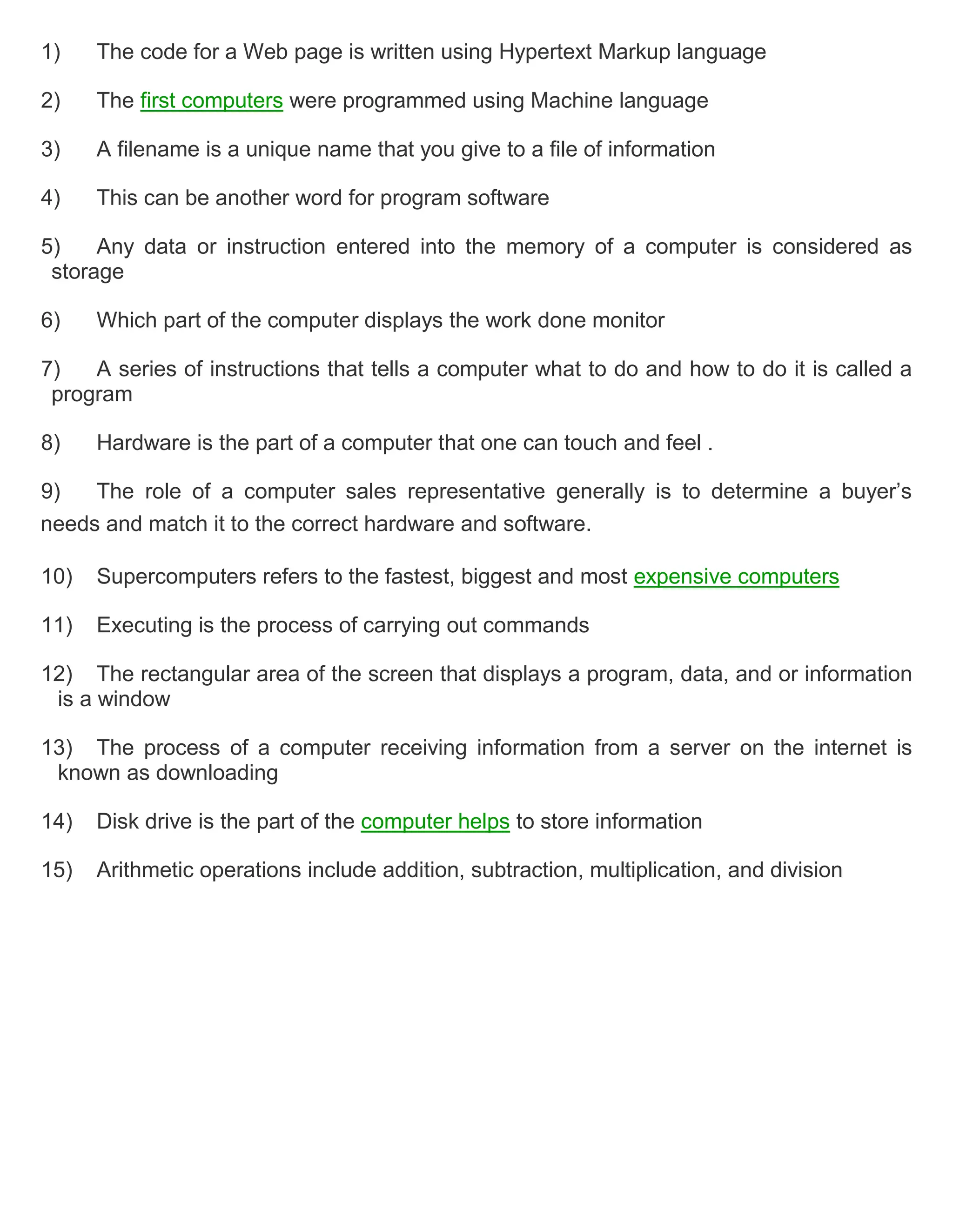 The document discusses various topics related to computers and technology. It defines key terms like Hypertext Markup Language, program, filename, hardware, software, operating system, monitor, network, server, internet, downloading, disk drive, arithmetic operations, keyboard, bug, file, email, menu, output devices, edit menu, virtual memory, binary system, windows key, home key, subject lines, formatting, storage, connectivity, syntax, algorithm, cursor, clipboard, spreadsheet, cell, topology, modem, application suite, utilities, database, input, fields, website address, subdirectory, chart, microcomputer hardware, toolbar, new command, input device, programming language, topology, laptop, utility software, cell address, byte