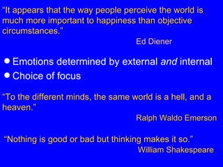 The document discusses how people's perceptions and interpretations of reality influence their happiness and well-being more than objective circumstances. It argues that focusing on benefits rather than faults can lead to greater well-being, health, and longevity. The document also explores how cultivating gratitude through daily appreciation can create a growth spiral of positivity and increase life satisfaction.