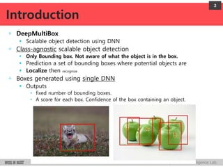 DeepMultiBox is a scalable object detection method using deep neural networks that detects objects in a class-agnostic manner. It predicts bounding boxes and confidence scores using a single DNN. It formulates object detection as a regression problem to optimize bounding box coordinates and confidences. It was shown to achieve competitive detection results on PASCAL VOC 2007 with faster runtime than other methods.