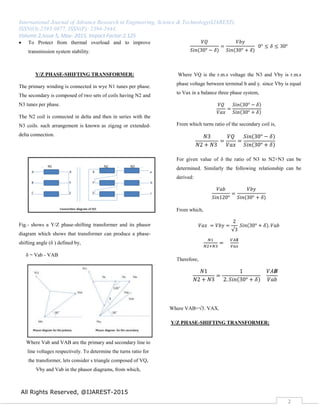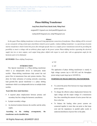 This document discusses phase-shifting transformers, which are special transformers used to control power flow in transmission networks. It describes how phase-shifting transformers work by providing a phase-shifted voltage output, and explains their purposes like controlling power flow between systems and balancing loads. The document focuses on Y/Z and Δ/Z configurations, explaining how they produce a phase shift angle. It also covers protections for phase-shifting transformers and concludes by discussing an 18-pulse rectifier circuit that eliminates the need for a phase-shifting transformer.