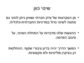 שינוי כוון מןהעקרונות של צדק חברתי ושוויון ניתן לגזור גם מתווה לשינוי גדול במדיניות החברתית - כלכלית . ההצעות שלנו מדברות על התחלת השינוי , על סיבוב הפרסה . המשך הדרך יהיה בדיון ציבורי שקוף . ההחלטות הן בעיקרן פוליטיות ולא מקצועיות .