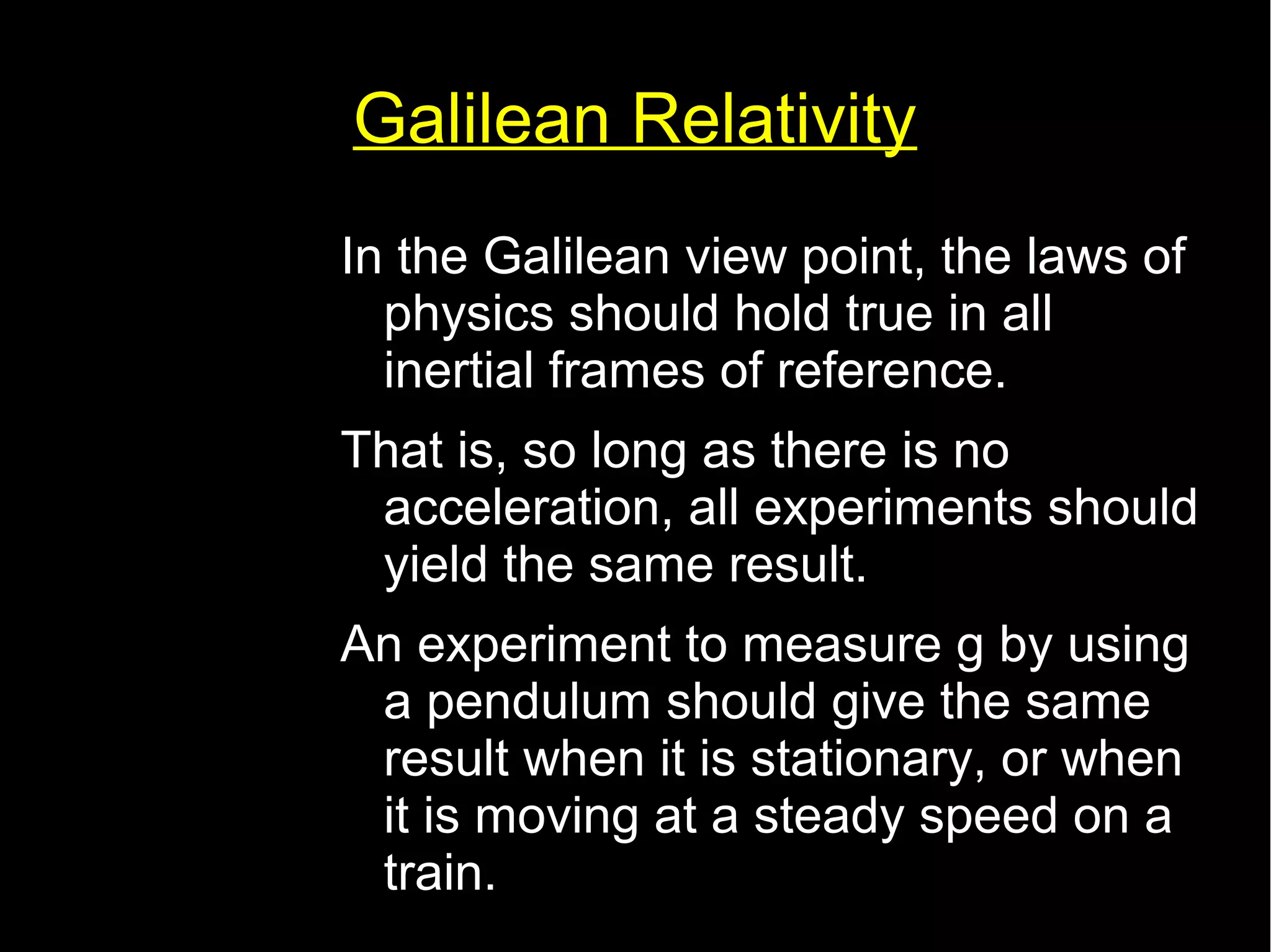 This document discusses Einstein's theory of special relativity and its implications. It begins by describing Galilean relativity and frames of reference. It then discusses Michelson-Morley's famous experiment which found that the speed of light is constant regardless of the motion of the observer, contradicting the theory of the luminiferous aether. This led Einstein to postulate that the laws of physics are the same in all inertial frames and that the speed of light in a vacuum is constant. The document explores the implications of these postulates through various thought experiments, showing that simultaneity is relative, time dilates and lengths contract for moving observers. It concludes by discussing some implications of special relativity like mass-energy equivalence and the twins paradox