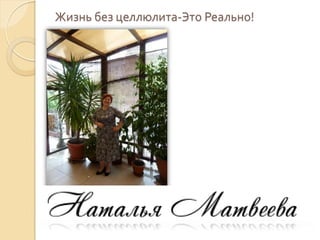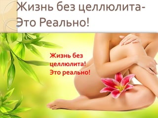 Документ предлагает программу из 7 шагов для избавления от целлюлита, включая советы по правильному питанию, физическим упражнениям и психологическому настрою. Он также описывает опасности целлюлита для здоровья и косметические методы борьбы с ним. Автор утверждает, что при соблюдении системы можно достичь гарантированных результатов и предлагает оформить заказ на антицеллюлитные продукты.