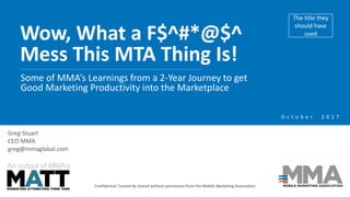 The MMA and its MATT initiative have been working for over 2 years to better understand multi-touch attribution (MTA) and how to help marketers improve measurement and attribution of marketing campaigns. MATT conducted several studies measuring real campaigns and found that optimizing campaigns by including mobile often increased key metrics like sales by over 10%. MATT also found that targeting and personalizing mobile campaigns could further increase metrics by hundreds of percent. However, MTA is complex with many possible format, data, and targeting combinations to test. MATT aims to provide guidance to help marketers choose the right MTA providers and solutions.