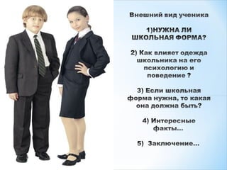 Проект ученицы 10-а класса Карьевой Анны обсуждает необходимость школьной формы, основываясь на мнениях учителей и учеников. Результаты опроса показывают, что учителя поддерживают введение формы, считая её важной для снижения социального неравенства, тогда как ученики выступают против, считая, что форма подавляет индивидуальность. Заключение указывает на то, что необходимость школьной формы актуальна лишь для младших классов.