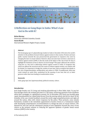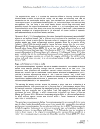 The document discusses the limitations of using law as the primary tool to address violence against women in India. It notes that while legal reforms were demanded and passed in response to high-profile rape cases, such as the brutal gang rape of Jyoti Singh Pandey in 2012, violence against women has not decreased. The document argues that legal reforms alone are not effective and that addressing the root structural and cultural causes of gender-based violence through multi-sectoral strategies led by autonomous feminist social movements is needed for meaningful change. It also examines the history and divisions within the Indian women's movement around relying on criminal law and the state to address violence against women.