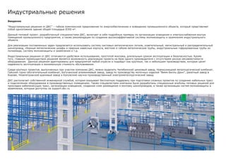 Документ описывает комплексные индустриальные решения от компании ДКС, предлагающие гибкие системы энергообеспечения и освещения для промышленных объектов. Проект включает рекомендации по организации электроснабжения, освещения и защиты от молний для зданий площадью 8350 м2, а также детали о конструкции и безопасности систем. Услуги компании поддерживаются собственными инженерными специалистами и охватывают как крупные, так и малые производства.