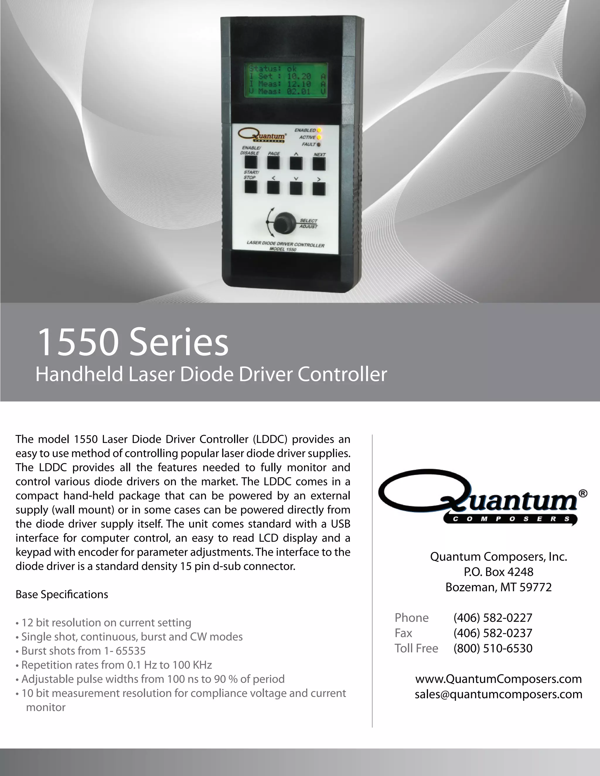 The 1550 Laser Diode Driver Controller (LDDC) provides monitoring and control of laser diode driver supplies in a compact hand-held device. It connects to drivers via a standard 15 pin connector and includes interfaces for computer control via USB, parameter adjustment via keypad and encoder, and readout of operating parameters on an LCD display. The LDDC supports single shot, continuous, burst and CW operation modes with adjustable pulse widths and repetition rates.