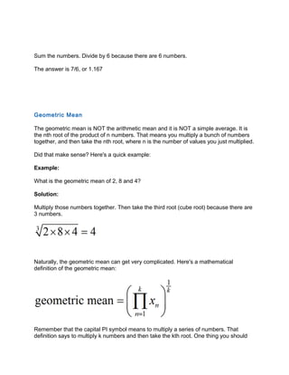 The document explains the concepts of arithmetic mean and geometric mean, outlining how to calculate each and the contexts in which they are used. It highlights that the arithmetic mean is the average computed by summing values and dividing by the count, while the geometric mean is the nth root of the product of values, applicable primarily for positive numbers. It also discusses the importance of using the geometric mean for calculating investment returns due to their interdependent nature.