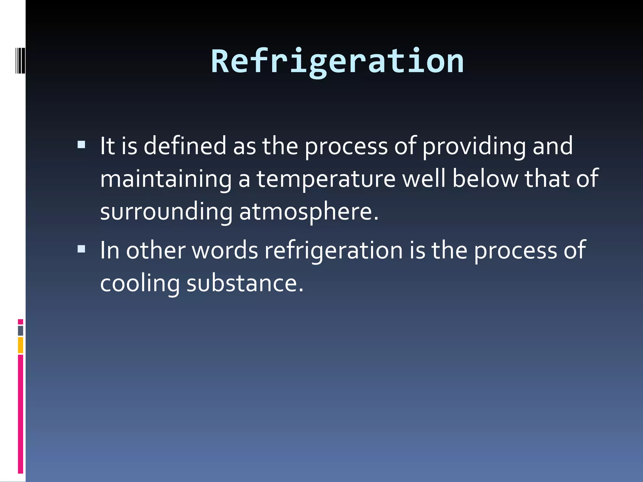 Refrigeration It is defined as the process of providing and maintaining a temperature well below that of surrounding atmosphere.  In other words refrigeration is the process of cooling substance.