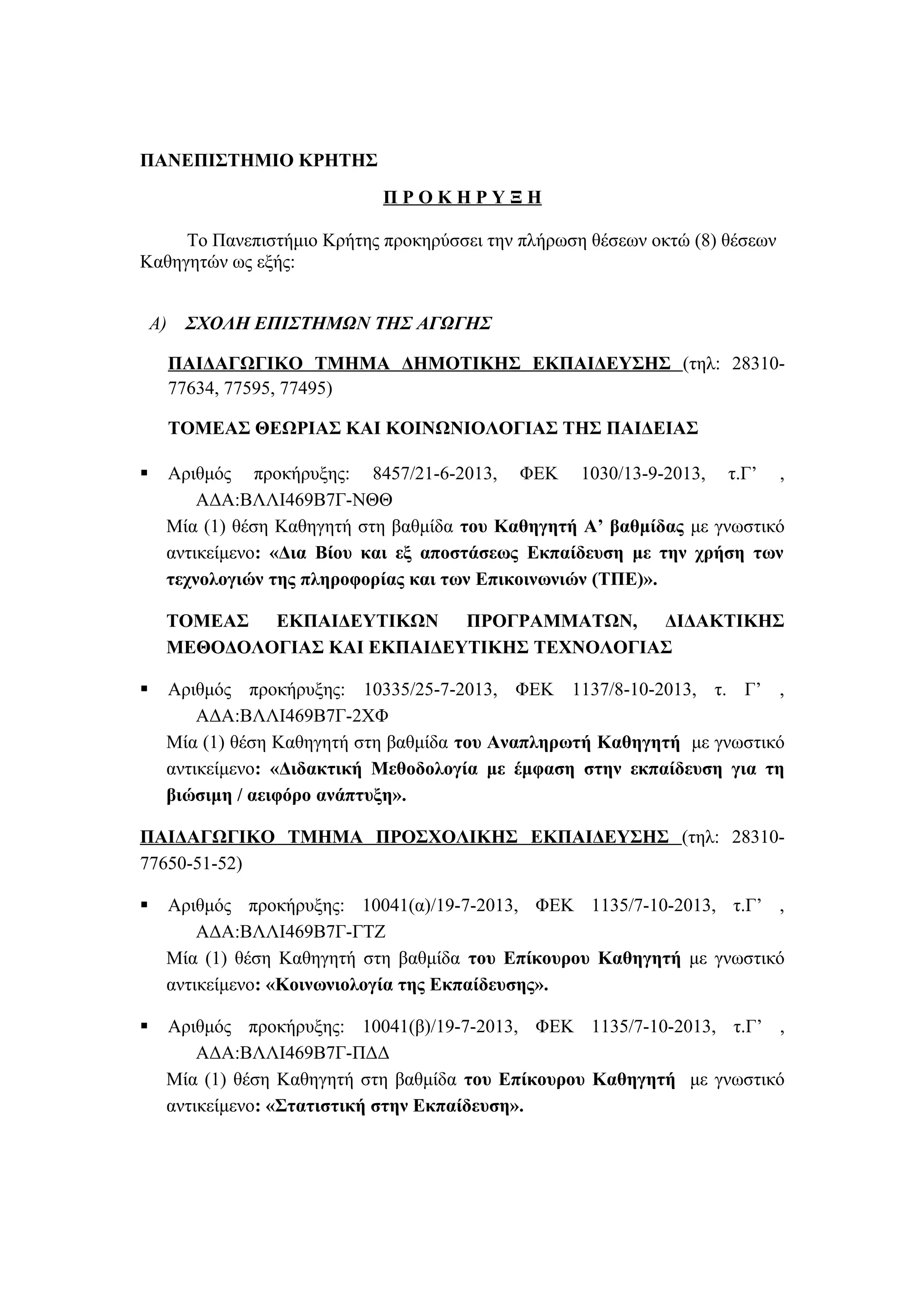 Αριθμός προκήρυξης: 8457/21-6-2013, ΦΕΚ 1030/13-9-2013, τ.Γ’ ,