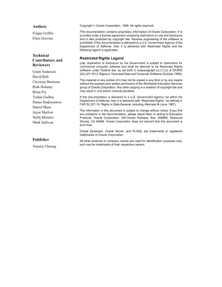 This document provides an instructor guide for the Oracle Developer: Build Forms I course, outlining the course objectives and content which teaches students how to use Oracle Forms Builder to create basic forms and applications. The guide includes 23 lessons on topics such as creating forms, working with items and triggers, and debugging and testing forms. It also contains appendices with additional reference material.
