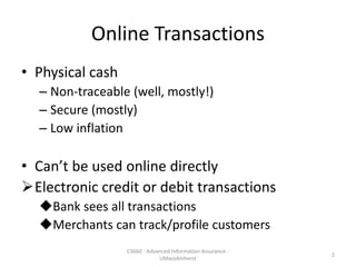 Bitcoin is a decentralized digital currency that uses cryptography to secure online transactions without relying on central authorities. It works by maintaining a distributed ledger called the blockchain that records all transactions. Transactions are authenticated through digital signatures and verified by the network through proof-of-work mining to prevent double spending. While providing pseudonymity, Bitcoin transactions are publicly visible on the blockchain, compromising user privacy. Zerocoin was proposed to add an anonymous currency layer on top of Bitcoin through cryptographic commitments and zero-knowledge proofs to allow untraceable transactions.
