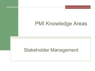 This document discusses stakeholder management, which is an important knowledge area for project managers. It identifies the key processes for managing stakeholders as identifying stakeholders, planning stakeholder management, managing stakeholder engagement, and controlling stakeholder engagement. The document provides examples of how to identify and classify stakeholders, as well as best practices for planning, engaging with, and controlling stakeholders over the course of a project. Managing stakeholders effectively is important for project success and addressing potential issues or changes that can impact organizations during a project.
