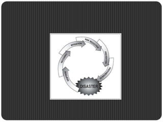 This document provides an overview of disaster management, including its key components and principles. It discusses that a disaster is a natural or man-made event that results in widespread human and economic losses. The four components of disaster management are preparedness, response, recovery, and prevention. Preparedness involves ensuring communities can cope with disasters through actions like education, warning systems, and training. Response aims to minimize effects during and after a disaster through plans, resources, and shelter. Recovery supports rebuilding infrastructure and restoring well-being. Prevention and mitigation try to eliminate or reduce disaster incidence and severity, such as through resistant buildings. The principles of disaster management are to minimize and prevent further casualties, rescue victims, provide first aid and evacuation,