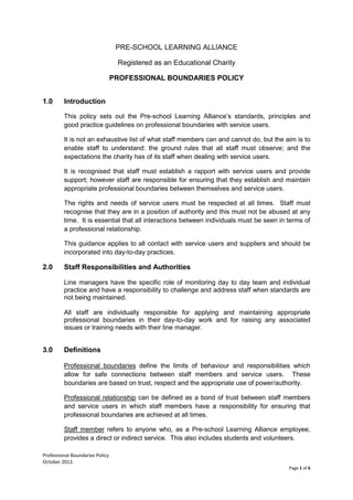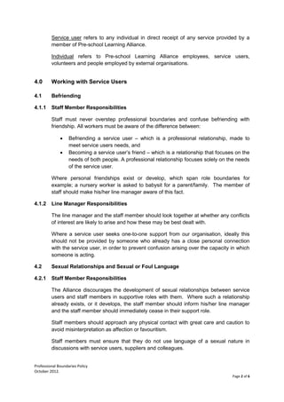 This document outlines professional boundaries policies for staff at the Pre-school Learning Alliance charity. It establishes guidelines for appropriate interactions with service users, including prohibiting sexual relationships, financial transactions, and oversharing of personal information. Staff must prioritize the needs of service users and maintain respectful, trusting relationships based on their professional roles. Managers are responsible for monitoring adherence to these standards and addressing any issues.
