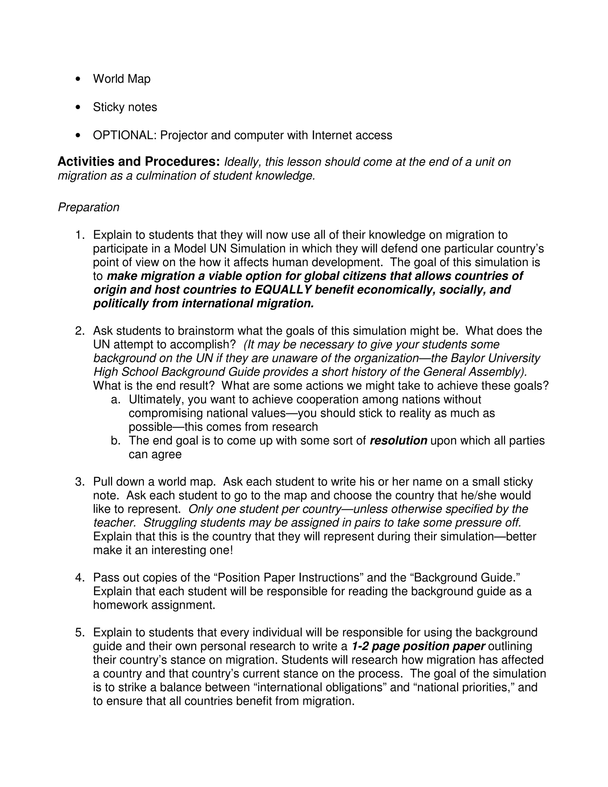 This document provides an overview of a lesson plan for a Model United Nations simulation on migration and development. The simulation allows students to take on the perspectives of different countries and explore how migration affects development and countries' policy stances. Students research their assigned country's position, write a position paper, and participate in a mock UN General Assembly debate to negotiate a resolution on managing global migration. The goal is for students to think critically about multiple views and utilize public speaking and negotiation skills to reach agreements balancing national and international interests regarding migration.