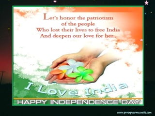 The document summarizes India's Independence Day, which is celebrated annually on August 15th. It marks the day in 1947 when India gained independence from British colonial rule after nearly a century of struggle. Independence Day celebrations involve hoisting the Indian flag, listening to speeches by leaders, and remembering the sacrifices made by freedom fighters. It is an occasion for Indians to renew their hopes and dreams for the nation while also paying tribute to those who fought for their freedom.