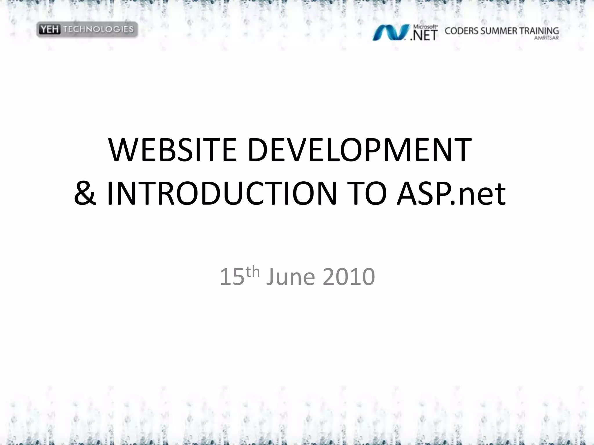 This document provides an introduction to website development and ASP.NET. It discusses what websites are, the differences between static and dynamic websites, and an overview of ASP.NET. It also summarizes the ASP.NET application lifecycle and provides an example of a first ASP.NET application that displays the current date and time.
