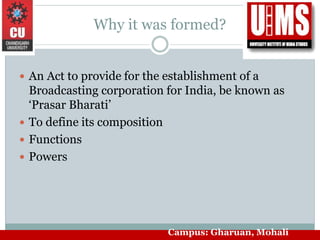 The Prasar Bharati (Broadcasting Corporation of India) Act was established in 1990 to create an independent public service broadcaster called Prasar Bharati. The act defines Prasar Bharati's composition, functions, and powers. It is governed by a board with a chairman and other members. Prasar Bharati's primary duty is to organize and conduct public broadcasting on radio and television to inform, educate, and entertain the public in an unbiased manner. It focuses on diverse topics like education, rural development, science, and culture. The corporation prepares an annual financial statement and can establish offices across India with government approval.