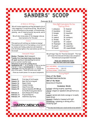 This document provides an overview of lessons and activities for January 8-11. It will include a review of expository writing and comparing it to narrative writing. In math, students will begin Topic 10 on fraction concepts, including equivalent fractions. Students should study their multiplication facts in preparation for Beat the Facts starting the following week. The document also provides the teacher's contact information and assigns the story "How Night Came from the Sea" for the week.