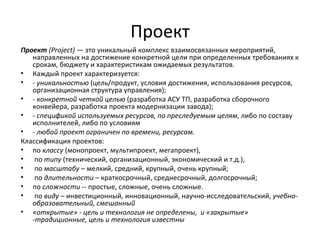 Документ описывает основы управления проектами, включая определения, классификации и основные характеристики проектов. Он также охватывает этапы жизненного цикла проектов, стратегии, цели и критерии успеха, а также методологии, применяемые в управлении проектами. В заключение, документ подчеркивает важность процессов и областей знаний, необходимых для эффективного управления проектами.