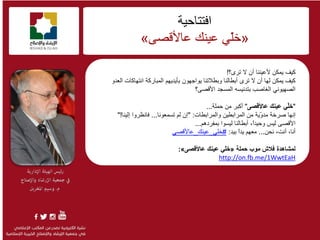 ٟف اٌغبس٠خ األؽذاس ِغَّ٘جّ١ؽؼج خخٍٝػ ًاسد ؽبٍِخ االٔزٙبوبداإلعشائ١ٍ١خاألؽذاس ٖ٘ز رىبد ٚإر ،ٝااللق اٌّغغذ ّذم ّحشّاٌّغز اٌخ١ش٠خ ٚاإلفالػ اإلسؽبد عّؼ١خ أىٍمذ ،اإلػالِ١خ األمٛاء ٓػ ثؼ١ذح رقجؼ ؽٍّخ اإلعالِ١خ"ّلخًعاألقصى عٍنك"ٍٝػ اٌنٛء رغٍ١و إػبدح ثٙذف ٞ٠غش ِٚب ٓ١فٍغيف١ٙب،ٗأسم ٟف َٚاٌّمب ٟٕ١اٌفٍغي ٌٍؾؼت اٌزأو١ذ ٚثٙذف ٠ٕغٛا ٌٓٚ ٌُ ،اٌذاخٍ١خ ُِّٙٛ٘ ِٓ ُٚثبٌشغ ،ٓ١١ٔاٌٍجٕب ْأُ٘أؽمبء،ْٚأ ُٙٔٛ١ػ ٟف ٝعزجم اٌمذط ٚػبفّزٙب ٓ١فٍغي. ِٛة فالػ ػجش اٌؾٍّخ أيٍمذ(فغبئ١خ رّض١ٍ١خ ِؾٙذ٠بد)ّفٔز٘بّٛػِٛزي األؽذ َٛ٠ ٞاٌجؾش ث١شٚد وٛسٔ١ؼ ٍٝػ ّبدثٚؽب ؽجبة ِٓ اٌغّؼ١خ 1/11/2015ٟاألسام ؽٙذرٙب ؽٙ١شح ِؾب٘ذ خّغخ ّحساٌّب َأِب ّذٚاغع ؽ١ش اٌفٍغي١ٕ١خُؾزٍخٌّا:ٞاٌز ٟٕ١اٌفٍغي ُّٓغٌّا فؾنشٌّٛػعٕٛد َأِب ٖثؼقب ،ٜاألخش ثبٌ١ذ ٚاٌؾغبسح ث١ذ اٌىزبة ًّؽ ٞاٌز ٟاٌغبِؼ ٚاٌيبٌت ،االؽزالي وّب ،ٗٙٚع ٍٝػ ػش٠نخ اثزغبِخ ُ٠شع ٛ٘ٚ اٌغٕٛد ٍٗ٠ؼزم ٞاٌز ٚاٌؾبة ٟف َدشؽنْ٠َذِٙؾًٓثى ٓ١ِٚاٌّمب ْ٠غبػذ ٟاٌٍٛار اٌفٍغي١ٕ١بد ّبدثّبؾٌا ٚاٌغالػ ثبٌؾغبسح ُ٘رضٚ٠ذ ػجش ؽغبػخ.ْٚوباٌّؾٙذ٠خ ٖ٘ز ْأ اٌالفذ ِٓ ّ٠اٌزؼج١شخاعزٛلفذًاػذدٓ٠اٌز اٌّش٠غخ ٓ١ػ وٛسٔ١ؼ ٍٝػ ّحساٌّب ِٓ ًاوج١ش اٌغٛاٌخ ُٙثٙٛارف ٌٍزقٛ٠ش عبسػٛا...ٌٍّض٠ذ ؽٍّخ«ٝػبأللق ػ١ٕه ٍّٟخ»