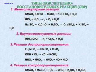 Документ описывает окислительно-восстановительные реакции, включая их классификацию и уравнивание. Рассматриваются межмолекулярные и внутримолекулярные реакции, диспропорционирование и конпропорционирование, а также алгоритм составления уравнений. Также приводится информация о электролизе и законе Фарадея, включая расчеты, связанные с протеканием электричества через электролиты.