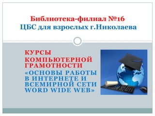 Библиотека-филиал №16 г. Николаева предлагает бесплатные курсы компьютерной грамотности для всех желающих с начала июня 2012 года. Цель курсов заключается в обучении пользователей основам компьютерной грамотности и новым возможностям обслуживания в библиотеке. По результатам обучения были подготовлены 76 занятий, в которых приняли участие 48 человек разных возрастных категорий.