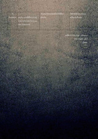 ปฏิทินการปฏิบัติงาน (เลือกโครงงานที่ได้จากใบงานที่ 15 ทากิจกรรมนี้ส่งครู เป็นผลงาน พร้อมCDบันทึกข้อมูล และรายงาน 1 เล่ม ขนาดA5 ไม่เกิน 8 หน้า รวมปก พิมพ์จากกระดาษA4 เย็บสันกลาง สอด CD ไว้ปก หลังใน ปฏิทินการปฏิบัติงาน โครงงาน ทายาทโขน รูปแบบการจัดทาโครงงาน E – Book จากเรื่องที่เลือก วันเดือนปี – เวลา รายการปฏิบัติงาน กิจกรรมที่จัดทา หมายเหตุ 3/9/56 เลือกโครงงานและรูปแบบ ในการจัดทา -เลือกทาโครงงาน ทายาทโขน รูปแบบผลงานเป็น E – book เท่านั้น 3/9/56 ปฏิบัติการทาโครงงาน -หาข้อมูลที่เกี่ยวข้อง -หาแหล่งข้อมูล 7/9/56 ส่งให้ครูตรวจสอบครั้งที่ 1 -คุณครูตรวจสอบและชี้แนะแนวทาง 7/9/56 ปฏิบัติการทาโครงงาน (ต่อ) -ลงมือปฎิบัติ 9/9/56 ส่งให้ครูตรวจสอบครั้งที่ 2 -นาผเสนอโครงงานอีกครั้ง เพื่อให้ครู ประเมิน ให้คาแนะนา 13/9/56 บันทึกลงแผ่น CD และทา รายงานประกอบ -นาผลงานมาปรับปรุง แก้ไข ให้ดูขึ้น บันทึกลงแผ่น CD และทารายงาน ประกอบ ให้ทาเป็นเอกสาร ขนาด A5 (พิมพ์จากกระดาษA4 ไม่เกิน 2 แผ่น แบ่ง ซ้าย ขวา เย็บสันกลาง ปกหลัง ในติดซองซีดีที่เป็น พลาสติก