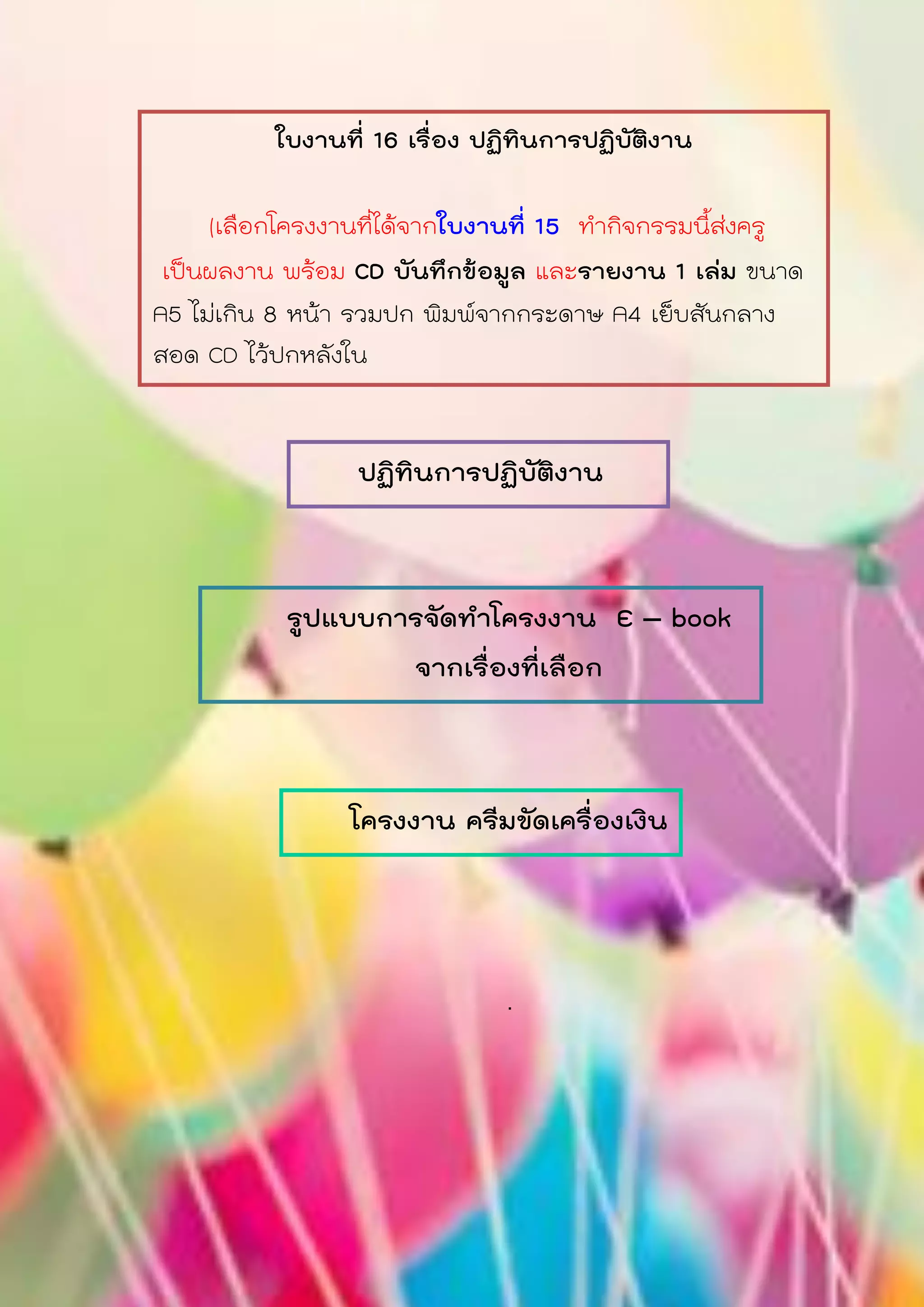 ปฏิทินการปฏิบัติงาน (เลือกโครงงานที่ได้จากใบงานที่ 15 ทากิจกรรมนี้ส่งครู เป็นผลงาน พร้อม CD บันทึกข้อมูล และรายงาน 1 เล่ม ขนาด A5 ไม่เกิน 8 หน้า รวมปก พิมพ์จากกระดาษ A4 เย็บสันกลาง สอด CD ไว้ปกหลังใน ปฏิทินการปฏิบัติงาน โครงงาน ครีมขัดเครื่องเงิน รูปแบบการจัดทาโครงงาน E – book จากเรื่องที่เลือก