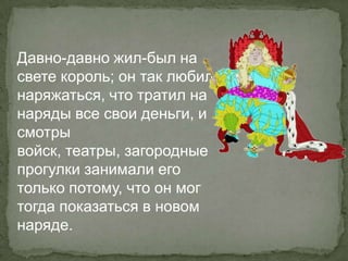 Документ рассказывает о короле, который был одержим модой и согласился на создание дизайнерского ателье, но вскоре оказался втянутым в мошенническую схемy из-за магической ткани, которая делала невидимыми тех, кто не был на своем месте. Когда король, боявшийся выглядеть глупо, не решился просмотреть платье из этой ткани сам, он отправил своих министров, которые также не признали правду. В результате ателье закрылось, инвесторы разорились, а король остался без уважения и народа.