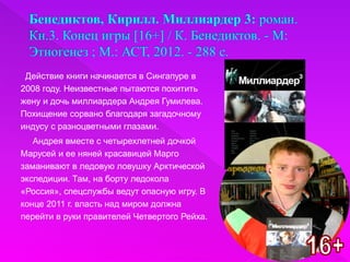 Документ описывает разные литературные произведения, охватывающие множество тем и жанров, включая приключения, драму и психологический роман. Среди упомянутых книг - истории о дружбе, любви и приключениях, таких как похищение миллиардера, жизнь юноши по имени Холден Колфилд и возвращение героя из войны. Книги написаны ярким языком и пронизаны глубокими идеями и конфликтами.