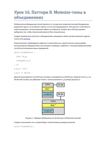 Документ посвящен использованию объединений (union) в языке программирования C/C++, подчеркивая особенности работы с memsize-типами и указателями. Рассматриваются примеры, демонстрирующие, как корректно манипулировать памятью и избегать алгоритмических ошибок при переносе кода на 64-битные системы. Включены рекомендации по использованию диагностического инструмента для поиска проблем в коде.