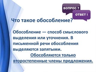 Документ объясняет понятие обособления в русском языке, которое служит для смыслового выделения или уточнения второстепенных членов предложения с использованием запятых. Рассматриваются различные типы обособления, включая согласованные и несогласованные определения, а также приложения и обстоятельства. Включены примеры и объяснения особенностей их использования в письменной речи.