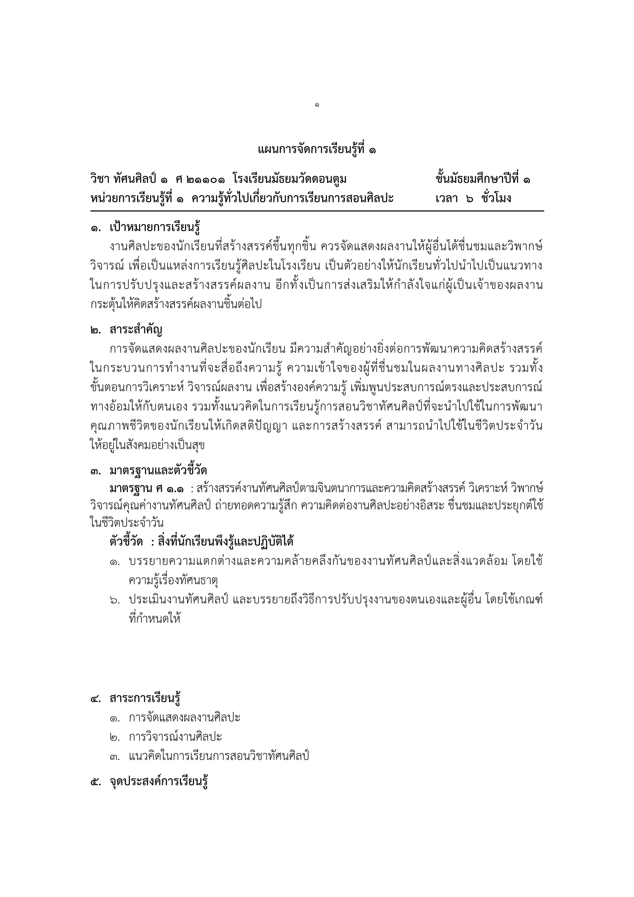 ข้อเสนอแนะ/แนวทางแก้ไข ……………………………………………………………………………………………………. ……………………………………………………………………………………………………. ……………………………………………………………………………………………………. ……………………………………………………………………………………………………. ……………………………………………………………………………………………………. ลงชื่อ...............................................ครูผู้สอน (...............................................) วันที่.......เดือน..........................พ.ศ. ............ ๔. ข้อเสนอแนะรองผู้อานวยการฝ่ายวิชาการ ………………………………………………………………………………………………………….………. …………………………………………………………………………………………………….……………. ………………………………………………………………………………………………………….………. ………………………………………………………………………………………………………..…………. ……………………………………………………………………………………………………..……………. ลงชื่อ............................................................... ( นำงสำวโสภำ ขำเจริญ ) แผนการจัดการเรียนรู้ที่ ๖ วิชา ทัศนศิลป์ ๔-๖ โรงเรียนมัธยมวัดดอนตูม ชั้นมัธยมศึกษาปีที่ ๔-๖ หน่วยการเรียนรู้ที่ ๖ รับรู้คุณค่างานศิลปะ เวลา ๓ ชั่วโมง