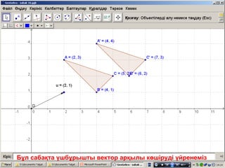сабақ (16) вектор бойынша үшбұрышты көшіру 1. GeoGebra Сабақ 16 Вектор бойынша үшбұрышты көшіру Дайындаған : Байназаров Талғат Пайдаланған ресурс: http://mathandmultimedia.com/2010/03/17/geogebra-tutorial-vector-translation/ geogebra.org 2. 3. 4. 5. 6. 7. 8. 9. 10.