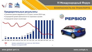 Документ описывает систему спутникового мониторинга 'Безопасное вождение' компании ГК Скаут, направленную на снижение аварийности на дорогах России через контроль стиля вождения корпоративного транспорта. Система фиксирует опасные маневры и позволяет компаниям улучшать безопасность, снижать затраты на топливо и страхование, а также улучшать имидж. В документе представлены статистические данные о снижении ДТП и страховых случаев с 2013 по 2015 год.
