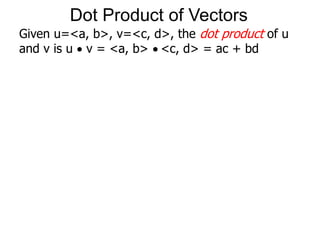 The document discusses unitizing vectors. In an example, a vector v = <3, 4> is unitized by rescaling it to obtain the unit vector <3/5, 4/5>. In general, to unitize a vector v, we divide it by its length |v| to obtain the unitized vector 1/|v| * v, which geometrically corresponds to shrinking or stretching v to have a length of 1.