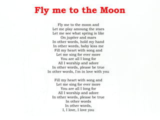 This document contains lyrics to 15 songs sung by Frank Sinatra: Fly Me to the Moon, As Time Goes By, Beguine the Beguine, Cheek to Cheek, Come Fly with Me, It Was a Very Good Year, (I've Got You) Under My Skin, My Way, New York New York, Night and Day, Singin' in the Rain, Something Stupid, Stormy Weather, Strangers in the Night, and Yesterday. The lyrics span Sinatra's career and include many of his most famous songs.