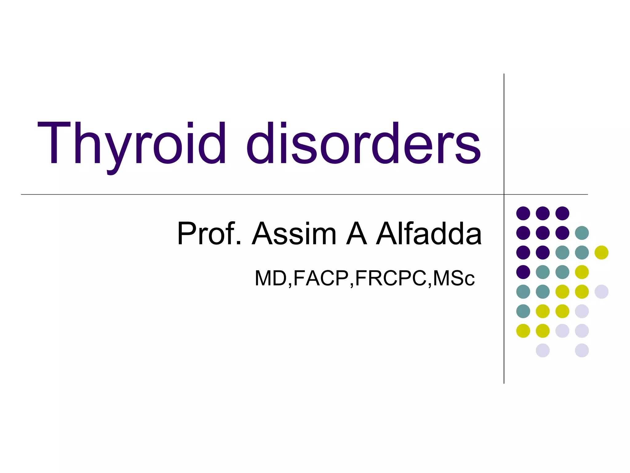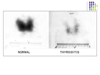 The document discusses thyroid disorders such as hypothyroidism, hyperthyroidism, goiter, and thyroid nodules. It provides historical context on the evaluation and treatment of thyroid disease dating back to ancient times and outlines key advances in surgical techniques. Current understanding and management of thyroid disorders is also reviewed including causes, pathogenesis, diagnosis, and treatment options.