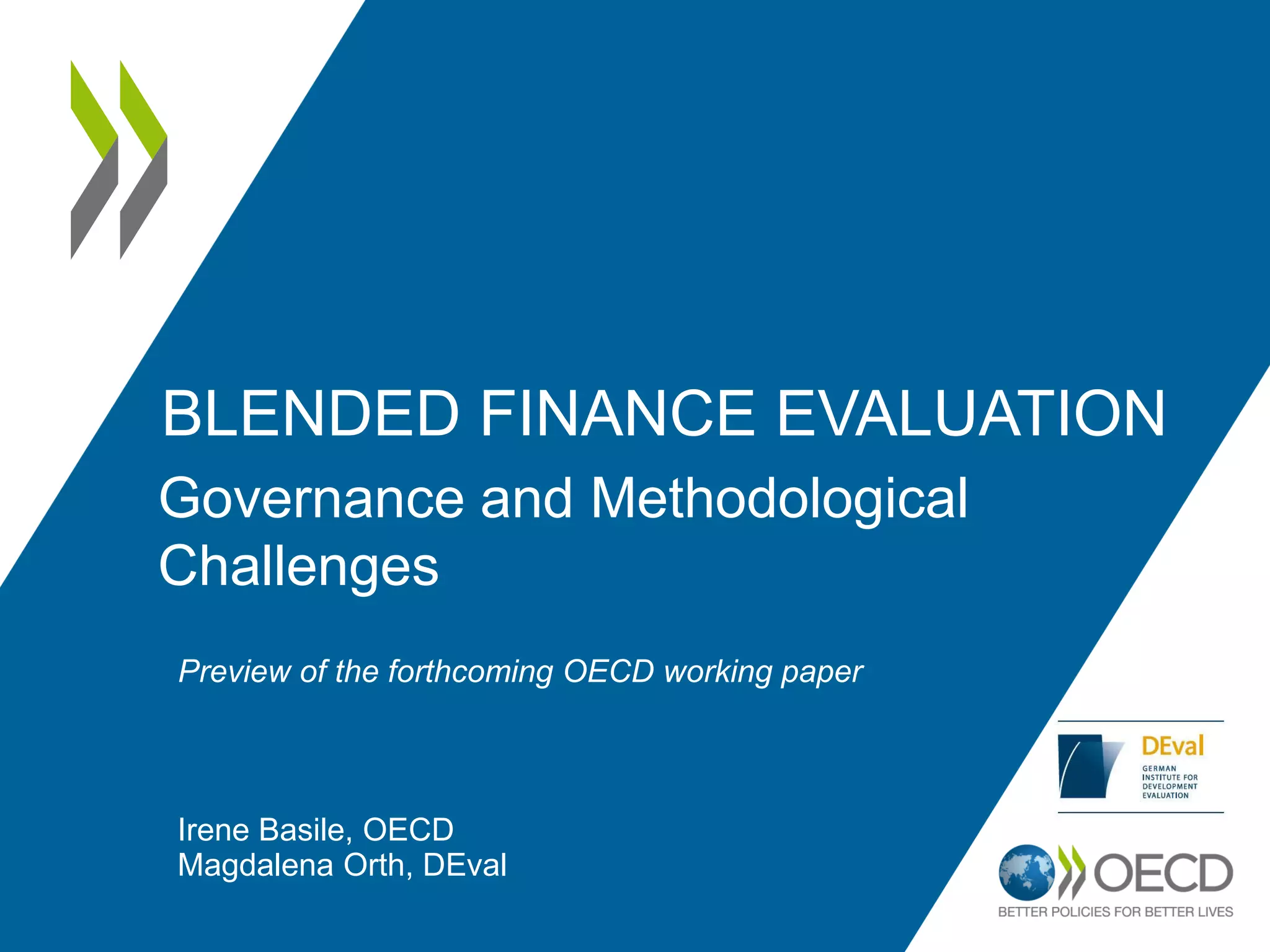 The document discusses the challenges of evaluating blended finance, including management and organizational diversity, methodological difficulties, and the need for stronger coordination in monitoring and evaluation practices. It highlights the necessity of definitions for additionality, as well as the varying approaches to evaluation among different financial institutions. The authors recommend enhancing access to data, adopting new methodologies, and fostering collaboration between stakeholders to improve the effectiveness of blended finance evaluations.