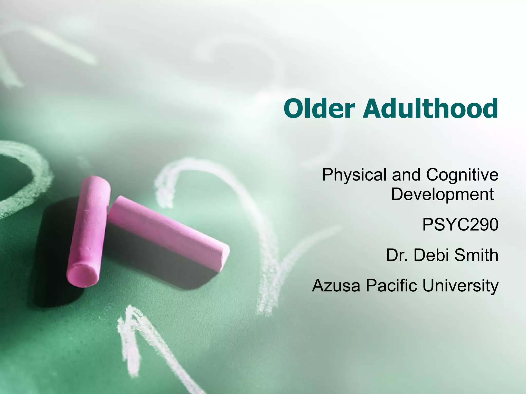 Older adulthood can be divided into three periods: young-old (60-69), middle-aged-old (70-79), and old-old (80-89). Physically, the body undergoes declines in most major systems as a result of earlier life events and lifestyle choices. Mentally, cognition and reaction time slow although dementia is not normal aging. Personality development focuses on adjusting to retirement, family/social roles, and government policies around increasing lifespans.