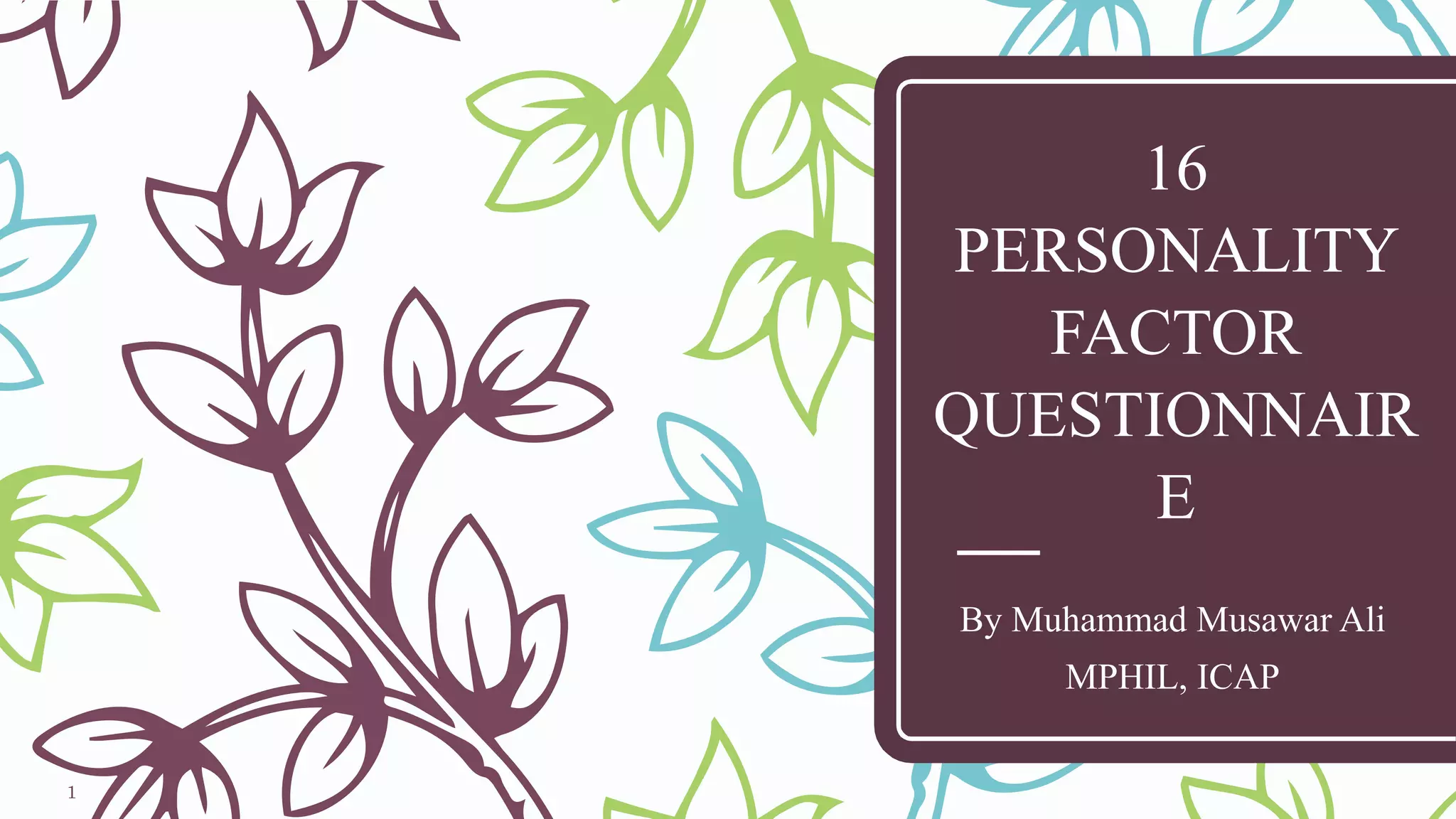 The document provides an overview of the 16 Personality Factor Questionnaire (16PF). It describes how Raymond Cattell developed the 16PF to measure normal personality traits based on 16 primary factors and 5 global factors. The 16PF is a self-report personality test that is widely used both in research and clinical settings. It provides a comprehensive personality profile through its primary scales, global scales, and validity scales.