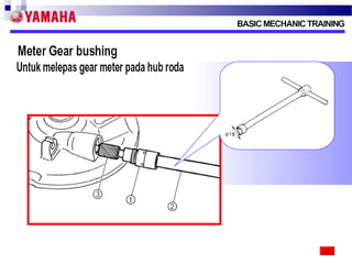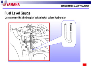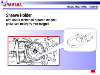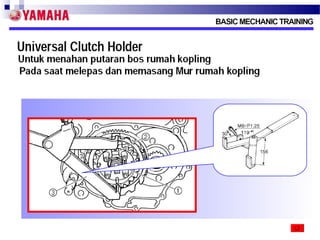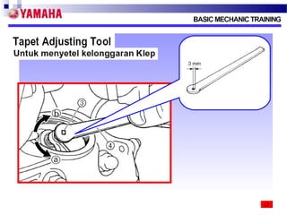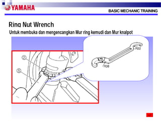 Dokumen ini menjelaskan berbagai jenis alat dan peralatan yang digunakan dalam bengkel, termasuk fungsinya, seperti penyimpanan alat umum, alat khusus, dan proses servis motor. Selain itu, terdapat juga informasi tentang kompresor, sistem penyaluran udara bertekanan, dan jadwal perawatan alat. Spesifikasi dan jenis oli yang digunakan juga dijelaskan secara rinci.