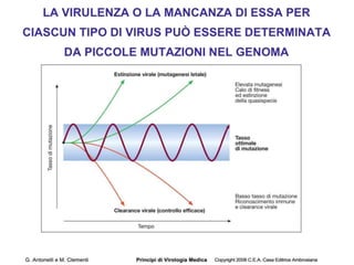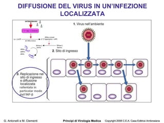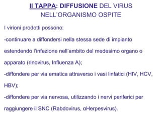 Il documento descrive la patogenesi delle infezioni virali, evidenziando il processo di ingresso del virus nella cellula e la sua capacità di replicarsi, alterando lo stato fisiologico della cellula infetta. Sottolinea le caratteristiche patogene dei virus come infettività, patogenicità, virulenza e tropismo, nonché le vie di ingresso e disseminazione dell'infezione nell'organismo. Infine, illustra gli effetti virali sulle cellule, inclusa la morte cellulare e le trasformazioni neoplastiche.