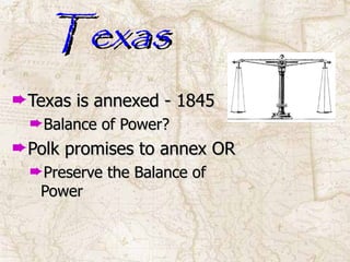 The document summarizes the United States' war with Mexico from 1845 to 1848, which resulted in the United States acquiring large swaths of territory in the modern-day American Southwest. Key events included the annexation of Texas in 1845, a border dispute along the Rio Grande that helped trigger open conflict in 1846, and General Winfield Scott's capture of Mexico City in 1847 that led to the Treaty of Guadalupe Hidalgo, in which Mexico ceded California, New Mexico, and other territories for $15 million. The new territorial acquisitions intensified debates over the expansion of slavery that contributed to the coming of the Civil War.