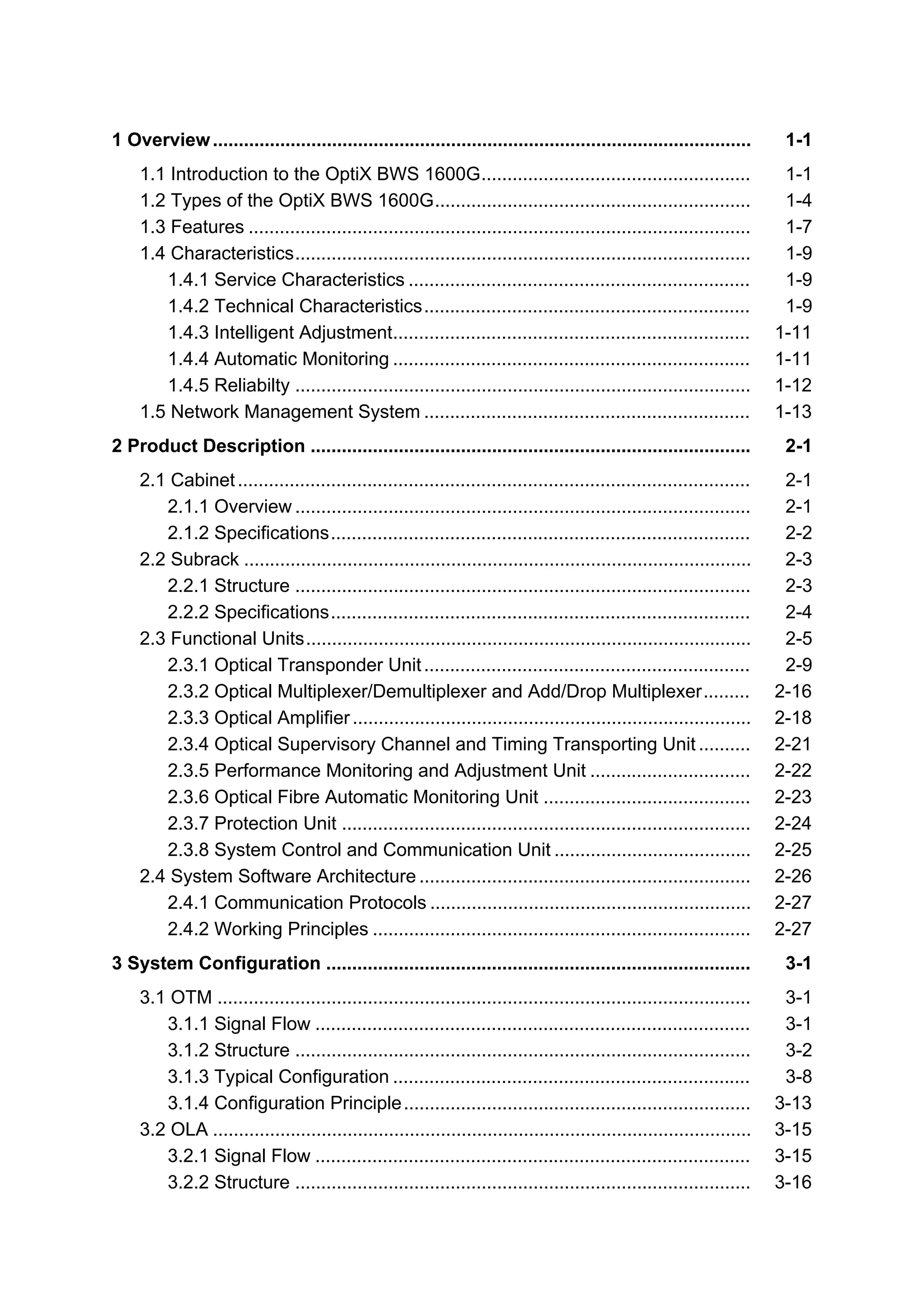 This document provides an overview and technical specifications of the OptiX BWS 1600G DWDM optical transmission system. It describes the system's types and features, including its intelligent adjustment capabilities, automatic monitoring functions, and high reliability. The system uses optical transponder units, multiplexers/demultiplexers, amplifiers, and other functional units. It supports various networking applications and configurations, such as linear, ring, and combined topologies. The document also covers the system's protection mechanisms, technical specifications, and design considerations.