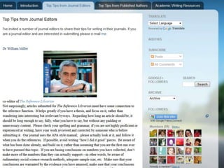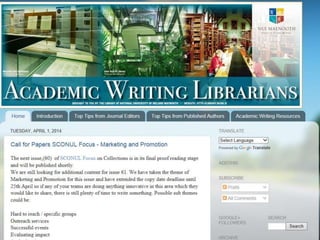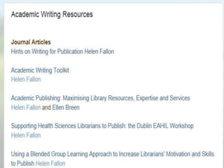 This document outlines the goals and tasks of a workshop on academic writing. The workshop aims to increase confidence, understanding of writing mechanics, and knowledge of publishing opportunities. Tasks include writing prompts, finding topics, making a case for publication, and outlining articles. The document provides guidance on structuring practice-based and research-based articles, as well as drafting, revising, submitting, and publicizing work. It also describes resources like an academic writing blog, toolkit, and online writing group to support participants' writing.